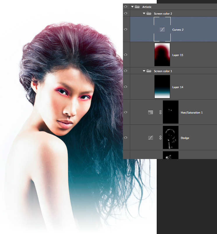 After your skin is good enough you can start having fun and caring about shine, volume, altering the makeup and so on. In this picture I did very little, there are two extra dodge and burn curve layers, and I used them a tiny bit in the hair, eyes, eyebrows and shoulders. I also used a hue/saturation adjustment to bump a little the makeup around the eyes.