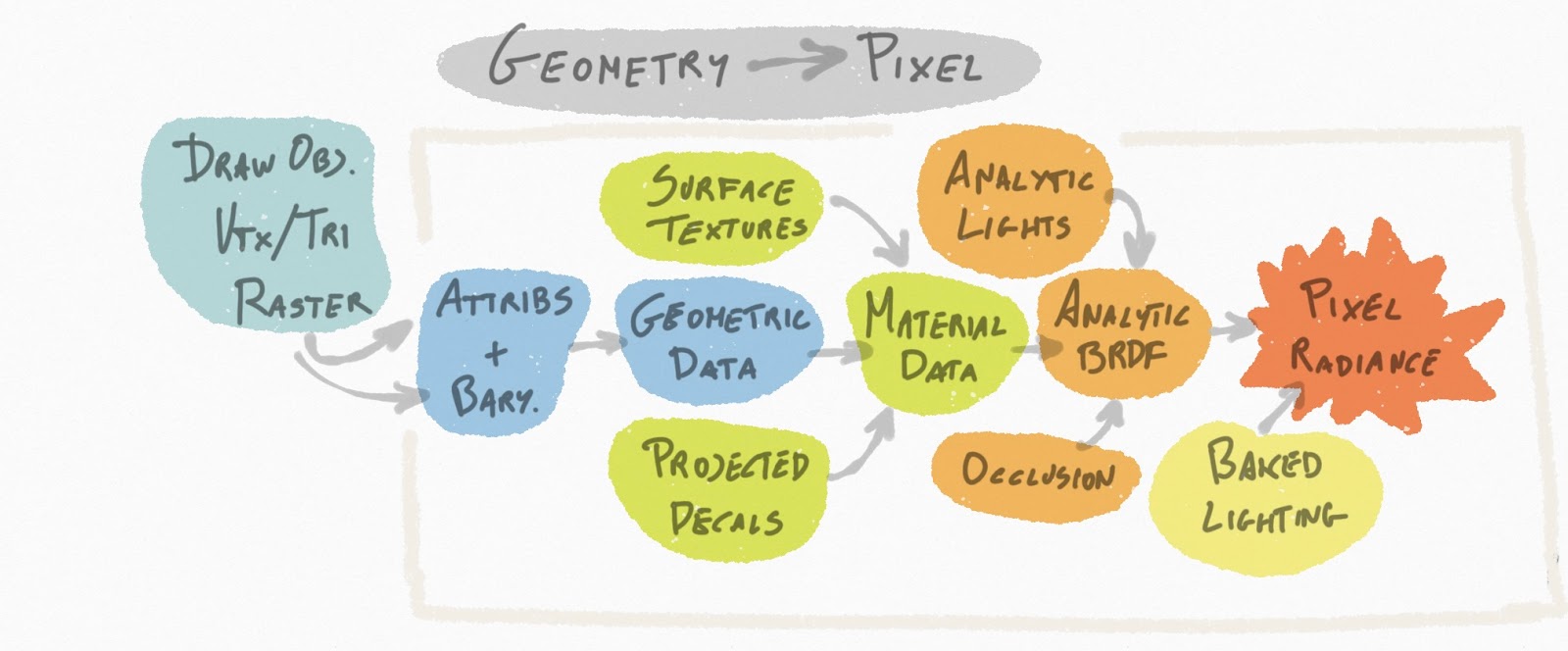 Not much to talk about at Siggraph there (with some exceptions), but with a great focus on mastering that rendering system: aggressive mesh splitting per lights and materials (texture layer groups), an engine -very- optimized to emit lots of drawcalls, and lightmapped GI (which manages to be quite a bit better than most of no-GI many-light deferred engines of the time).